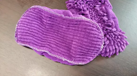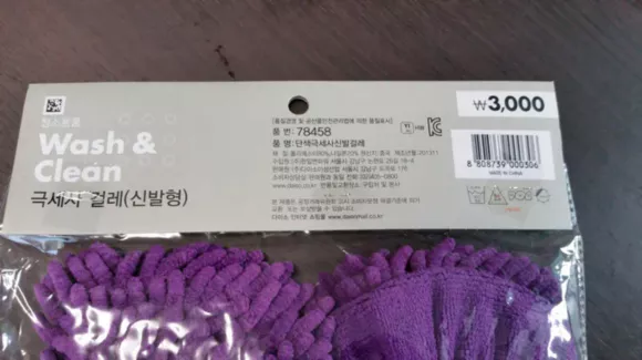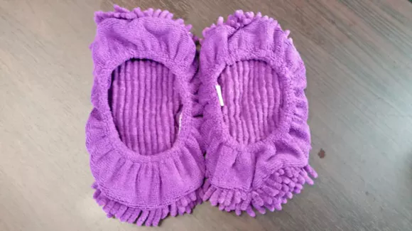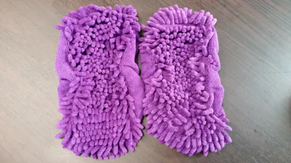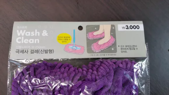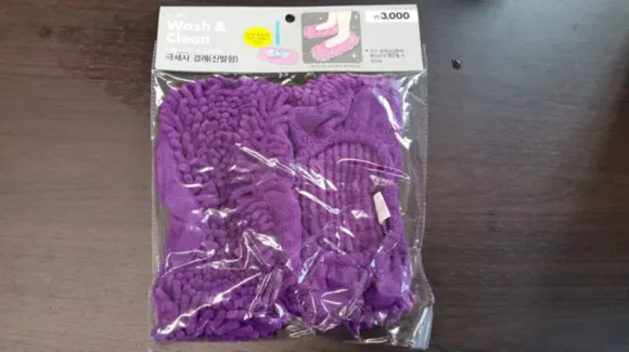 진한 보라색인데 형광등 불빛 때문인지 연한 보라색으로 사진이 찍혔습니다. 발에 신을 수 있는 걸레이지만, 앞과 뒤 구분이 없고 좌우 구분도 없습니다.