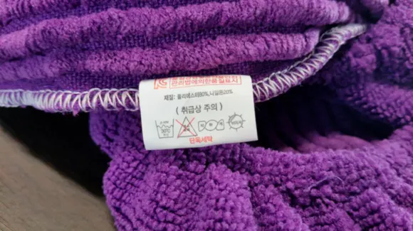 다이소 청소용 걸레 실내화 인쪽 부분에 취급상 주의 사항이 붙어 있습니다. 손세탁 30도 중성, 염소표백 불가, 약하게, 늬어서라고 적혀있습니다.